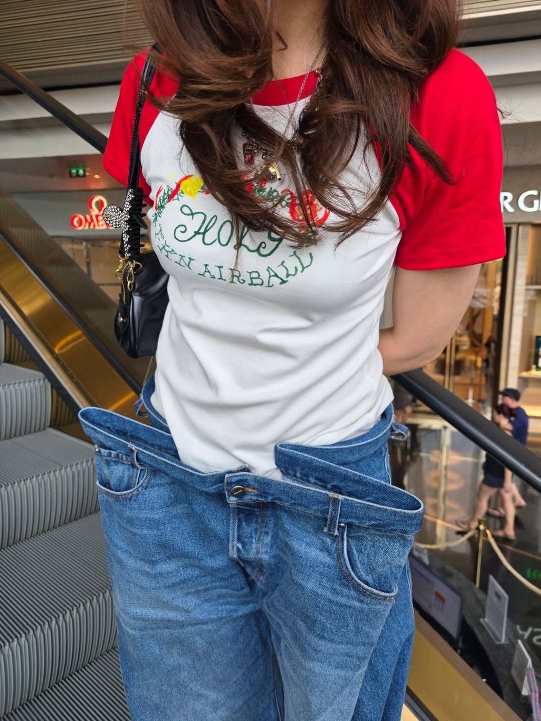 โดยชุดนี้แม่ชมมาในลุคเสื้อยืดคอกลมสีขาวแขนแดงแนวสปอร์ต แมตช์คู่กับกางเกงยีนส์ทรงกระบอกใหญ่ที่มีดีไซน์สุดล้ำ ด้วยลูกเล่นการตัดเย็บแบบ “กางเกงซ้อนกางเกง” ที่ดูเหมือนแม่ชมใส่กางเกงยีนส์สองตัวซ้อนกันอยู่ แถมขอบกางเกงตัวนอกยังกางกว้างออกมาจนดูแปลกตา บอกเลยว่าถ้าไม่ใช่ชมพู่ อารยา ใส่กางเกงตัวนี้ออกมาเดินห้าง คนทั่วไปใส่คงดูเป็นถังน้ำเดินได้แน่นอน!