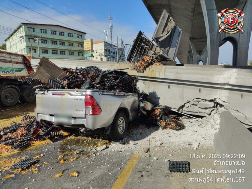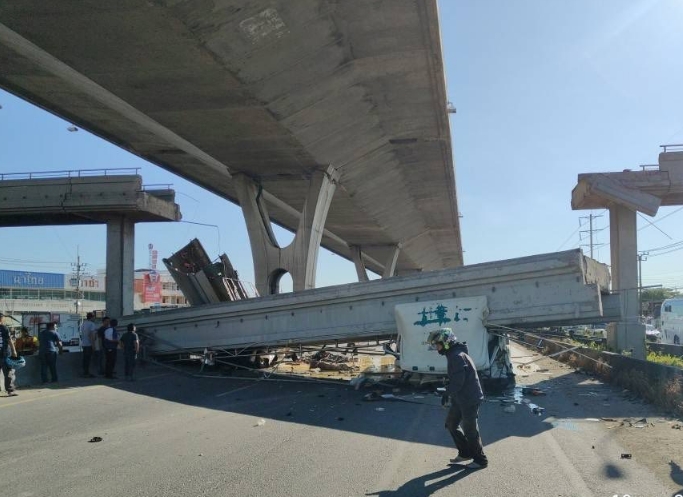 เกิดเหตุสะพานลอยคนข้ามทรุดตัว พังถล่มลงมาทับรถยนต์ มีผู้ติดอยู่ภายในรถ เหตุเกิดเมื่อเวลา 09.05 น. วันที่ 18 ธันวาคม 2568 บริเวณตลาดนัดนำชัย ตำบลบางพลีน้อย อำเภอบางบ่อ จังหวัดสมุทรปราการ