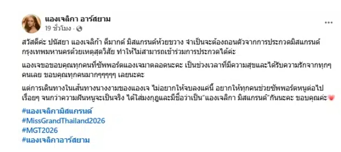 ปนัสยา แองเจลิก้า ดีมากด์” มิสแกรนด์ห้วยขวาง 2026 และเป็นหนึ่งในผู้เข้าประกวดที่เป็นตัวเต็งของเวที มิสแกรนด์กรุงเทพมหานคร 2026 ได้ออกมาประกาศถอนตัวจากการประกวด
