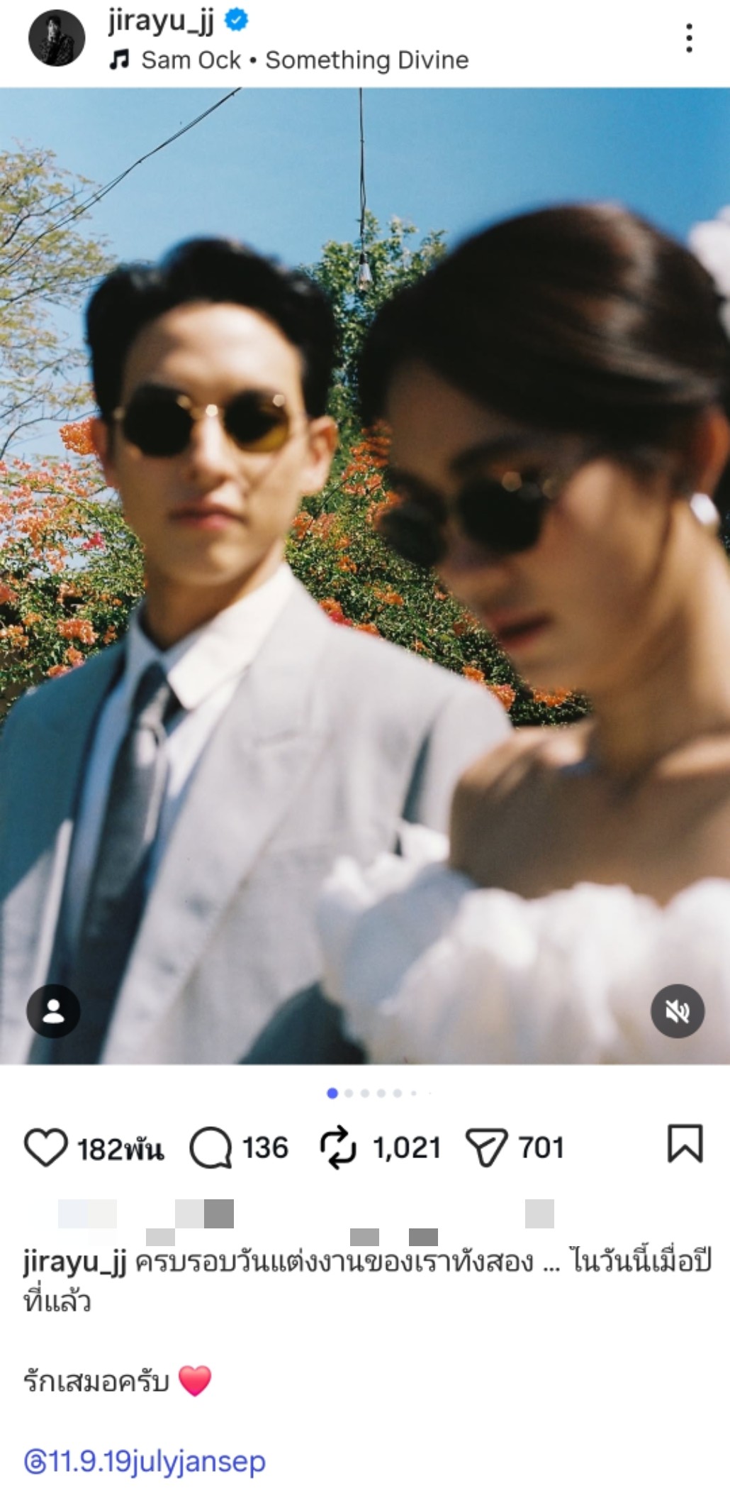 โดยภาพที่ลงนั้น เป็นโมเมนต์สุดละมุนที่ทั้งคู่สวมชุดเจ้าบ่าวเจ้าสาวเดินเคียงคู่กัน มีทั้งความเท่และความหวานที่ลงตัวสุดๆ แถมยังมีแขกรับเชิญคนสำคัญนั่นคือน้องสุนัขลูกรักร่วมเฟรมอยู่ด้วย หนุ่มเจมส์เขียนแคปชั่นสั้นๆ แต่กินใจว่า “ครบรอบวันแต่งงานของเราทั้งสอง … ในวันนี้เมื่อปีที่แล้ว รักเสมอครับ” แหม… พ่อไมโครเวฟของบ่าว! หวานสม่ำเสมอไม่มีแผ่วจริงๆ