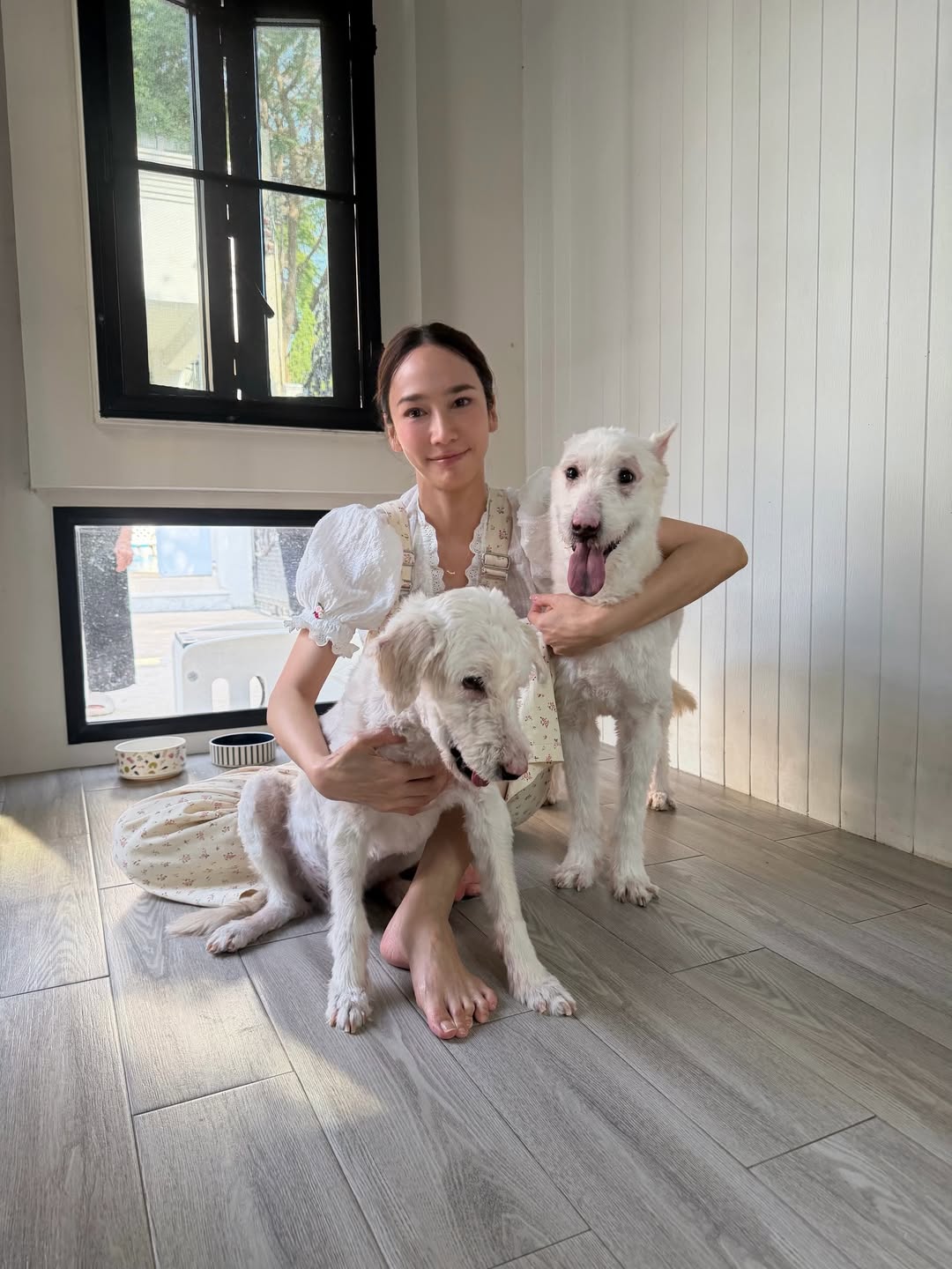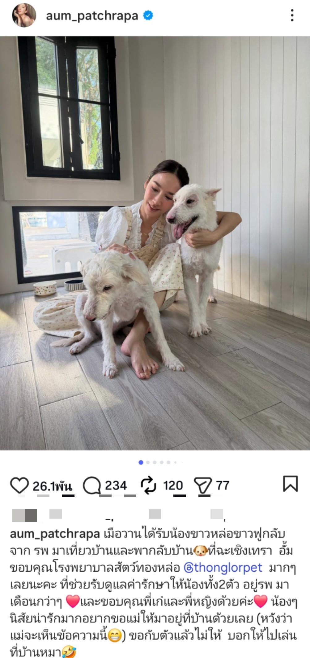 ​“เมื่อวานได้รับน้องขาวหล่อขาวฟูกลับจาก รพ มาเที่ยวบ้าน และพากลับบ้านหมาที่ฉะเชิงเทรา อั้มขอบคุณโรงพยาบาลสัตว์ทองหล่อมากๆ เลยนะคะ ที่ช่วยรับดูแลค่ารักษาให้น้องทั้ง 2 ตัว อยู่ รพ. มาเดือนกว่าๆ และขอบคุณพี่เก๋และพี่หญิงด้วยค่ะ”