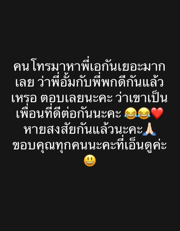 “คนโทรมาหาพี่เอกันเยอะมากเลย ว่าพี่อั้มกับพี่พกดีกันแล้วเหรอ ตอบเลยนะคะ ว่าเขาเป็นเพื่อนที่ดีต่อกันนะคะ หายสงสัยกันแล้วนะคะ ขอบคุณทุกคนนะคะที่เอ็นดูค่ะ”