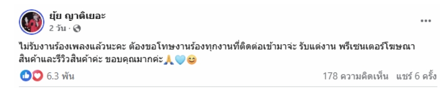 นักร้องลูกทุ่งชื่อดัง ยุ้ย ญาติเยอะ ได้ออกมาโพสต์ประกาศทางเฟซบุ๊กส่วนตัวว่าต่อจากนี้เจ้าตัวจะไม่รับงานร้องเพลงแล้ว