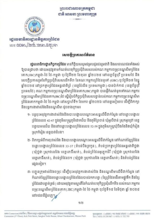 ขอเรียนแจ้งให้พี่น้องประชาชนและสาธารณชนทราบว่า ตามบันทึกการประชุมที่ตกลงกันไว้จากการประชุมพิเศษคณะกรรมาธิการร่วมกำหนดเขตแดนทางบกระหว่างกัมพูชา–ไทย (JBC) เมื่อวันที่ 22 ตุลาคม 2568 ณ จังหวัดจันทบุรี ประเทศไทย และตามแถลงการณ์ร่วมของการประชุมพิเศษครั้งที่ 3 ของคณะกรรมการชายแดนทั่วไปกัมพูชา–ไทย (GBC) เมื่อวันที่ 27 ธันวาคม 2568 ณ จุดผ่านแดนถาวรปรึม (จังหวัดไพลิน ประเทศกัมพูชา) – บ้านผักกาด (จังหวัดจันทบุรี ประเทศไทย) นั้น
