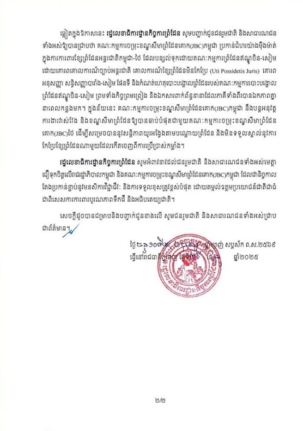 ในโอกาสนี้ สำนักงานเลขาธิการกิจการชายแดน ขอเรียนยืนยันต่อพี่น้องประชาชนและสาธารณชนว่า คณะกรรมาธิการร่วมกำหนดเขตแดนทางบก (JBC) ฝ่ายกัมพูชา ยึดมั่นอย่างแน่วแน่ในการพิทักษ์รักษาเส้นเขตแดนระหว่างประเทศกัมพูชา–ไทย ตามที่สืบทอดมาจากคณะกรรมาธิการกำหนดเขตแดนระหว่างอินโดจีนกับสยาม โดยเคารพกฎหมายระหว่างประเทศอย่างครบถ้วน หลักความไม่อาจละเมิดได้ของพรมแดน (Uti possidetis juris) อนุสัญญาและสนธิสัญญาฝรั่งเศส–สยาม แผนที่ และบันทึกการปักปันเขตแดนของคณะกรรมาธิการปักปันเขตแดนระหว่างอินโดจีนกับสยาม ตลอดจนข้อตกลงและเอกสารที่เกี่ยวข้องทั้งหมด ซึ่งทั้งสองฝ่ายได้เห็นพ้องต้องกันมาแล้ว