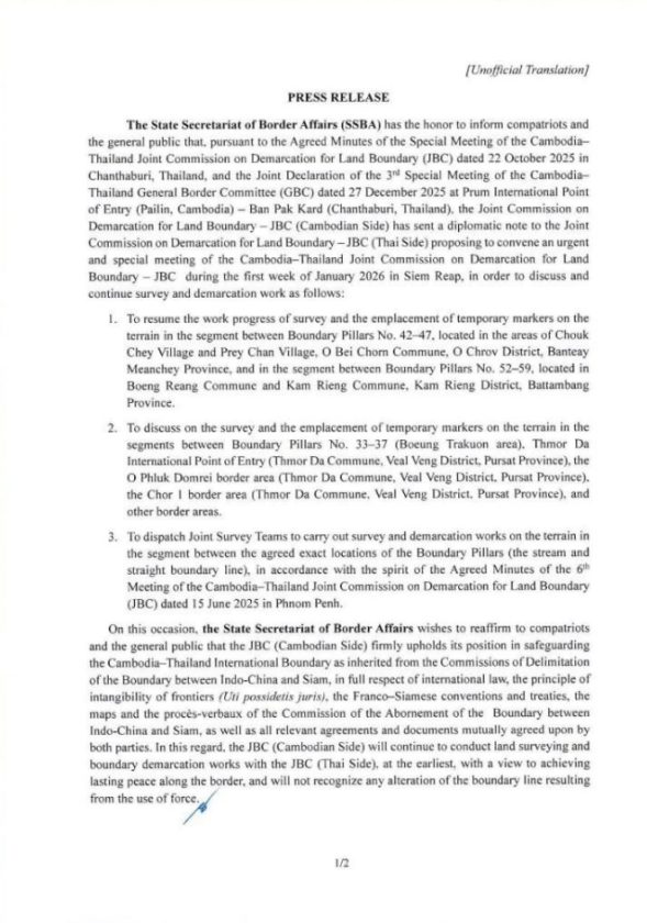 คณะกรรมาธิการร่วมกำหนดเขตแดนทางบก (JBC) ฝ่ายกัมพูชา ได้ส่งบันทึกทางการทูตถึงคณะกรรมาธิการร่วมกำหนดเขตแดนทางบก (JBC) ฝ่ายไทย เพื่อเสนอให้จัดการประชุมพิเศษเร่งด่วนของคณะกรรมาธิการร่วมกำหนดเขตแดนทางบกกัมพูชา–ไทย (JBC) ในช่วงสัปดาห์แรกของเดือนมกราคม 2569 ณ จังหวัดเสียมราฐ เพื่อหารือและเดินหน้าการดำเนินงานด้านการสำรวจ วัดแนว และปักปันเขตแดน ดังต่อไปนี้