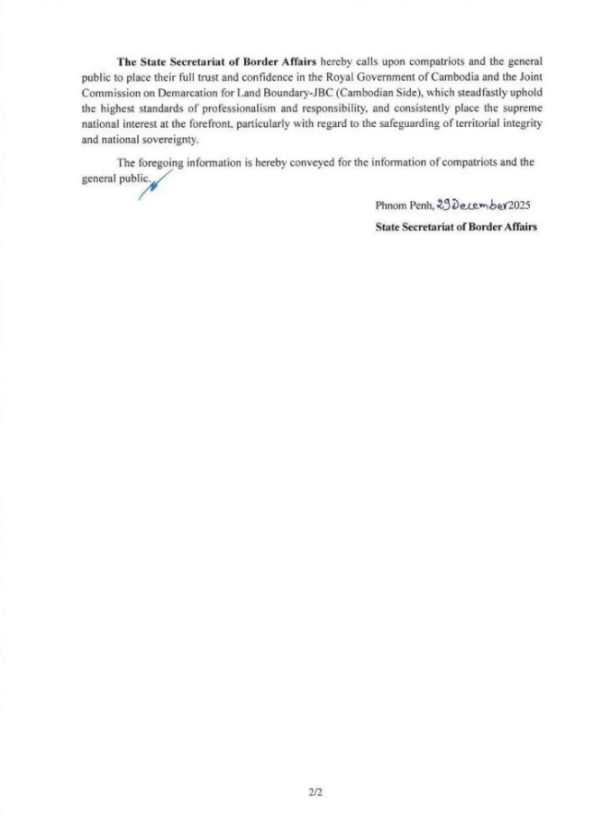 สำนักงานเลขาธิการกิจการชายแดน ขอเรียกร้องให้พี่น้องประชาชนและสาธารณชน มีความเชื่อมั่นและไว้วางใจอย่างเต็มที่ต่อราชอาณาจักรกัมพูชา และคณะกรรมาธิการร่วมกำหนดเขตแดนทางบก – JBC (ฝ่ายกัมพูชา) ซึ่งยึดมั่นในมาตรฐานสูงสุดด้านความเป็นมืออาชีพและความรับผิดชอบ และให้ความสำคัญสูงสุดต่อผลประโยชน์แห่งชาติ โดยเฉพาะอย่างยิ่งการพิทักษ์รักษาเอกภาพแห่งดินแดนและอธิปไตยของชาติ