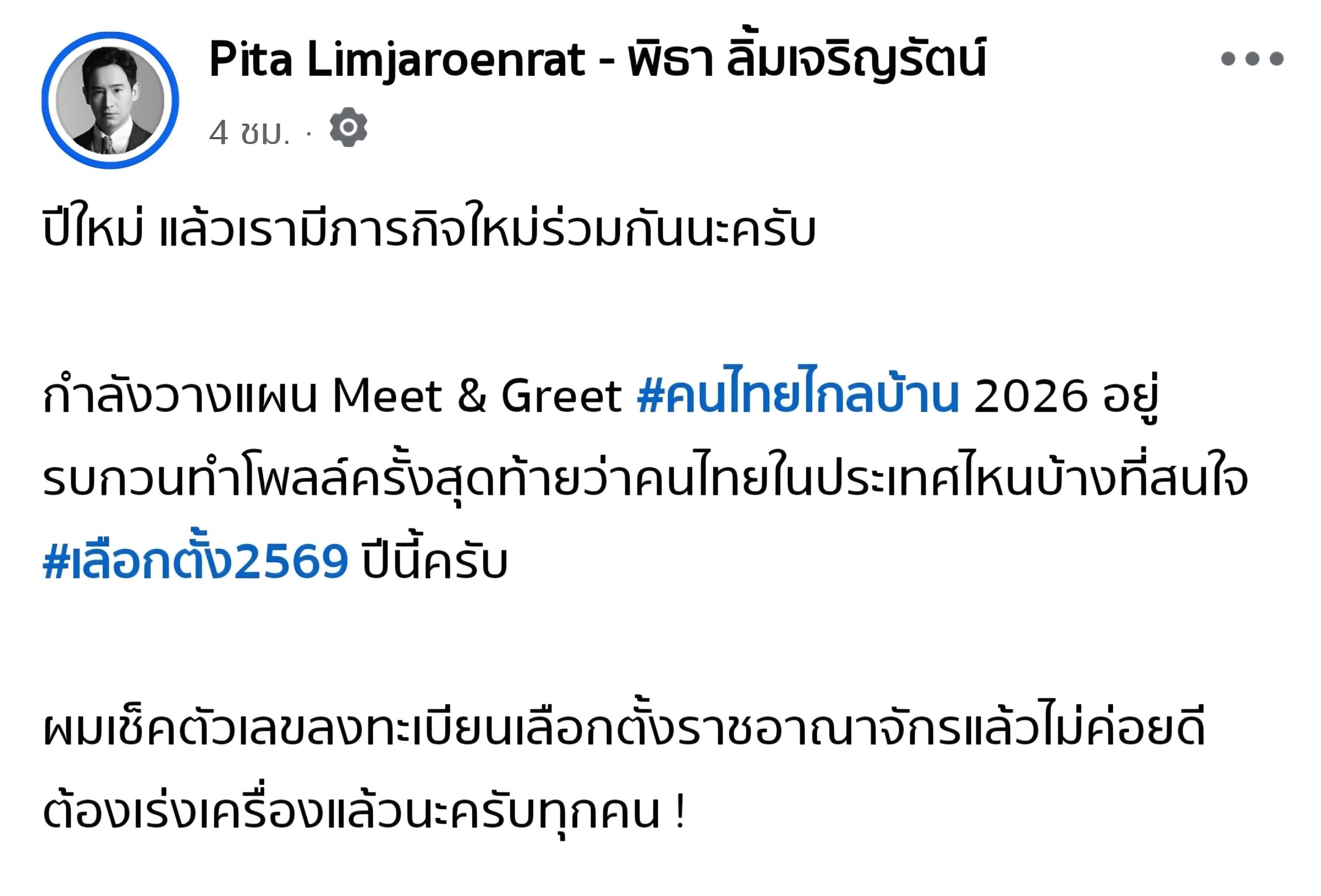 เริ่มต้นปี 2026 ด้วยความเคลื่อนไหวที่น่าจับตามอง! ล่าสุด “ทิม-พิธา ลิ้มเจริญรัตน์” ได้โพสต์ข้อความผ่านเฟซบุ๊กส่วนตัว ประกาศภารกิจใหม่ต้อนรับศักราชใหม่ทันที กับโปรเจกต์ Meet & Greet #คนไทยไกลบ้าน 2026 ที่เจ้าตัวเตรียมจะออกเดินทางไปพบปะพี่น้องชาวไทยในต่างแดน