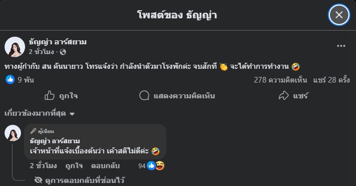 ต่อมา ธัญญ่าได้โพสต์ภาพร่วมกับเจ้าหน้าที่ตำรวจที่มาดูแลความปลอดภัยถึงบ้าน พร้อมขอบคุณทีมผู้กำกับ สน. คันนายาว ที่เข้ามาดูแลอย่างใกล้ชิด และยืนยันว่าจะติดตามตัวผู้ก่อเหตุให้ได้