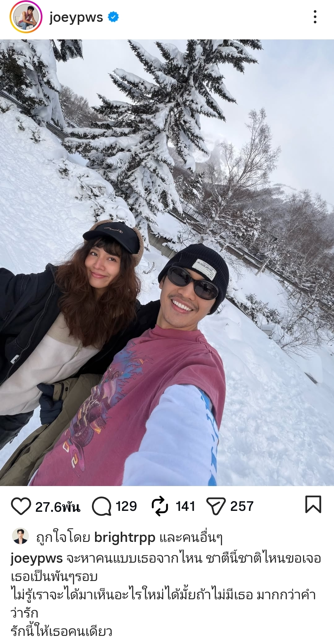 ล่าสุด (6 ม.ค. 69) ทำเอาแฟนคลับและเพื่อนพ้องร่วมวงการถึงกับต้องเอามือทาบอก แล้วอุทานว่า “อิจฉามาก!” เมื่อหนุ่มโจอี้จัดหนักจัดเต็ม ปาภาพคู่สุดมุ้งมิ้งโชว์ความหวานน้ำตาลเรียกพี่ลงโซเชียล พร้อมแนบแคปชันที่อ่านแล้วต้องกัดปากด้วยความหมั่นไส้ (แกมเอ็นดู) ว่า: