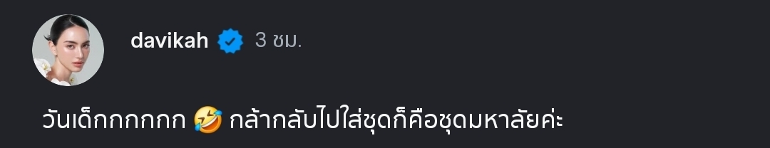 งานนี้ทำเอาเพื่อนพ้องในวงการและเหล่าแฟนคลับแห่คอมเมนต์กันถล่มทลาย เพราะนอกจากรูปร่างที่เป๊ะปังแล้ว ใบหน้าของสาวใหม่ในลุคนี้ยังดูละอ่อนและสดใสมาก จนหลายคนทักเป็นเสียงเดียวกันว่า “นี่คือนักศึกษาปี 1 ชัดๆ” บ้างก็บอกว่า “ถ้าไม่บอกว่าเป็นดาวิกา ก็คิดว่าน้องเฟรชชี่หน้าใหม่ที่ไหน”