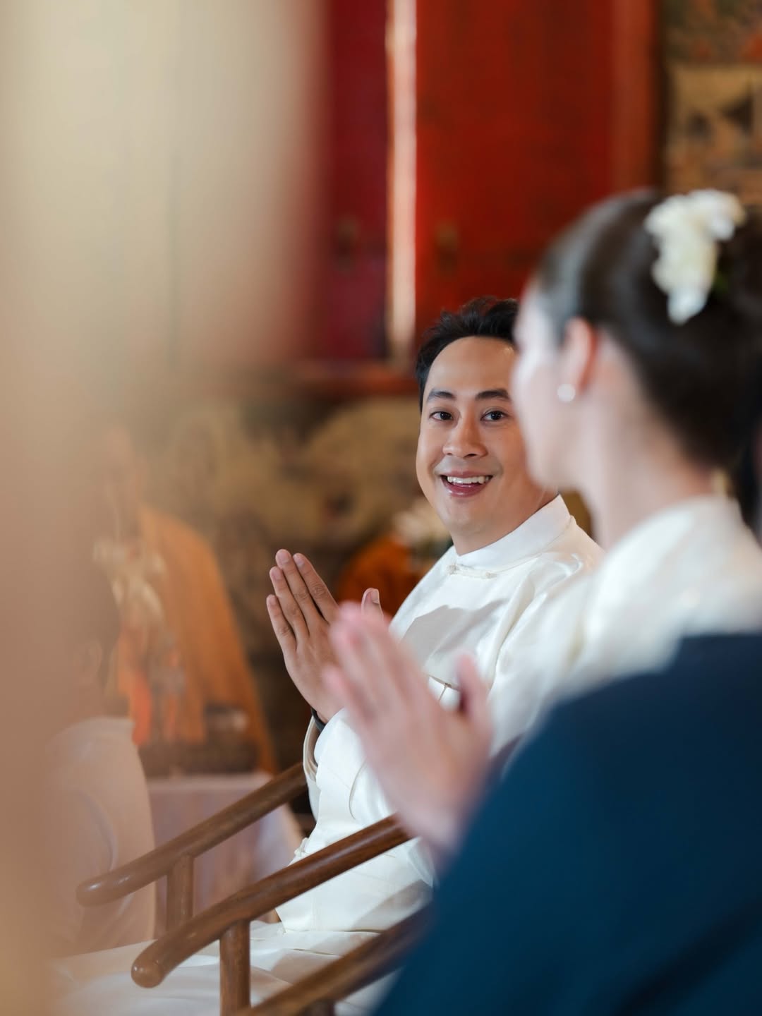 โดยงานนี้ทั้งคู่มาในชุดพื้นเมืองสีขาวนวลตา ฝ่ายหญิงสวมผ้าซิ่นทอละเอียดดูงดงามราวกับหลุดออกมาจากวรรณคดี ส่วนฝ่ายชายก็ดูภูมิฐานในชุดเสื้อพื้นเมืองเข้าเซตกัน ซึ่งพิธีในครั้งนี้ถือเป็นพิธีศักดิ์สิทธิ์ที่เน้นการเสริมดวงชะตาและเพื่อความเป็นสิริมงคลแก่ชีวิตและครอบครัว