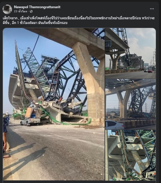แต่แล้วหลังจากลงโพสต์ดังกล่าวได้ไม่นาน ล่าสุดเมื่อช่วงสายของวันที่ 15 ม.ค.2569 ที่ผ่านมา ได้เกิดอุบัติเหตุคล้ายกันอีกครั้ง เมื่อเครนก่อสร้างทางยกระดับถนนพระราม 2 ถล่มลงมาบริเวณเกาะกลางถนน ทำให้มีผู้เสียชีวิตและได้รับบาดเจ็บ