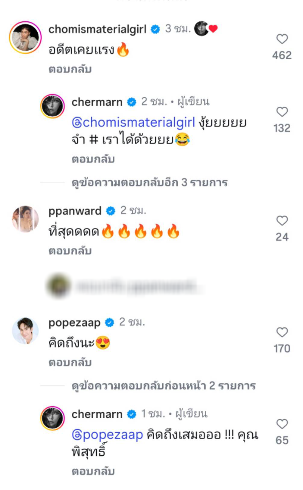 งานนี้โพสต์ดังกล่าวเพื่อนๆบันเทิง ก็เข้ามาเมนต์ ทั้ง ชมพู่ อารยา ที่เข้ามาเมนต์แบบจึ้งๆว่า “อดีตเคยแรง” จน มัมพลอย ต้องเข้ามาตอบ “งุ้ยยยยย จำเราได้ด้วยยย หรือจะเป็น โป๊ป ธนวรรธน์ อดีตพระเอกคู่ขวัญจากละคร สามีตรตรา คืนชีพตำนาน “คุณพิสุทธิ์-คุณกะรัต” นอกจากนี้ก็ยังมีเพื่อนๆคนบันเทิงอีกมายมากทั้ง เป้ย ปานวาด,ลิเดีย ศรัณย์รัชต์,วิกกี้ สุนิสา,เดียน่า ฟลีโป,เอมมี่ มรกต ฯลฯ