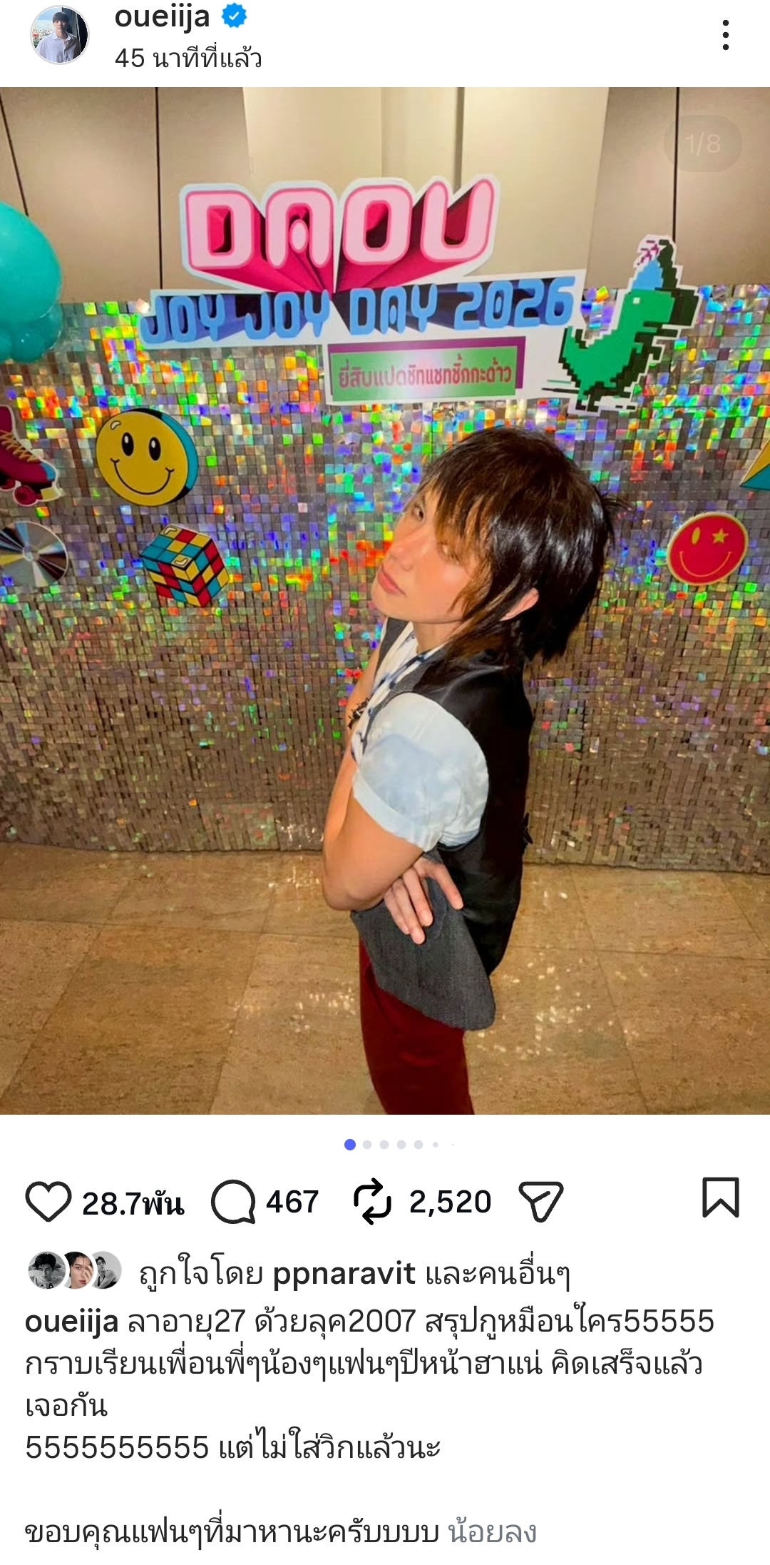 ​“ลาอายุ 27 ด้วยลุค 2007 สรุปกูเหมือนใคร 55555 กราบเรียนเพื่อนพี่ๆ น้องๆ แฟนๆ ปีหน้าฮาแน่ คิดเสร็จแล้วเจอกัน 5555555555 แต่ไม่ใส่วิกแล้วนะ ขอบคุณแฟนๆ ที่มาหานะครับบบบ”