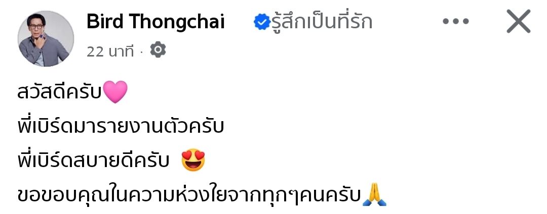 ล่าสุด “พี่เบิร์ด” ไม่ปล่อยให้แฟนๆ ต้องกังวลใจนาน ได้ออกมาโพสต์ข้อความผ่านเฟซบุ๊กส่วนตัว Bird Thongchai เพื่อสยบข่าวลือดังกล่าวทันที โดยระบุข้อความสั้นๆ แต่ชัดเจนว่า “สวัสดีครับ💗 พี่เบิร์ดมารายงานตัวครับ พี่เบิร์ดสบายดีครับ 😍 ขอขอบคุณในความห่วงใยจากทุกๆคนครับ 🙏” พร้อมอัปเดตสถานะความรู้สึกว่า “รู้สึกเป็นที่รัก”