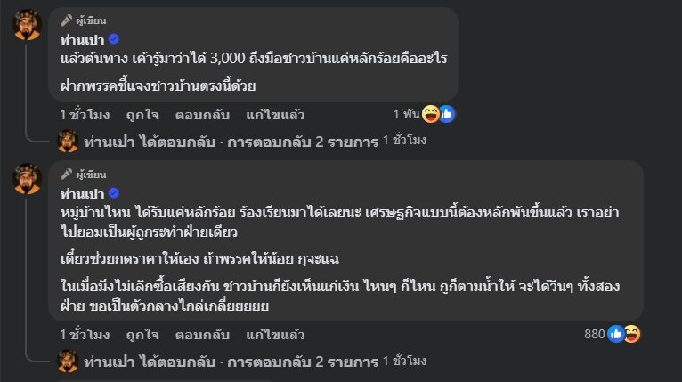 ชาวบ้านบางกลุ่มมองว่า หากมีการแจกเงินจริง ก็ควรมีมาตรฐานเดียวกัน ไม่ควรปล่อยให้เกิดความแตกต่างจนสร้างความไม่พอใจ พร้อมระบุว่าจะรวบรวมหลักฐานส่งให้เพจ เพื่อเรียกร้องให้มีการตรวจสอบและให้ความเป็นธรรม