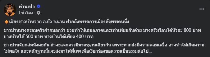 ล่าสุด เพจเฟซบุ๊ก “ท่านเปา” ระบุว่าได้รับข้อความร้องเรียนจากประชาชนในอำเภอปัว จังหวัดน่าน ซึ่งเป็นเสียงสะท้อนจากชาวบ้านบางส่วนที่รู้สึกไม่ได้รับความเป็นธรรม โดยมีการเล่าว่า บางครอบครัวได้รับเงินคนละ 800 บาท ขณะที่บางบ้านได้เพียง 500 บาท และบางรายได้แค่ 400 บาท ทำให้เกิดการเปรียบเทียบและพูดคุยกันในชุมชน