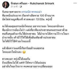 ล่าสุด วันที่ 25 ม.ค. 2569 รัชนก ศรีนอก ส.ส. และผู้สมัคร ส.ส. แบบบัญชีรายชื่อ พรรคประชาชน ได้ออกมาโพสต์ภาพ ตนเองคู่กับหมายศาล พร้อมแคปชั่นข้อความ