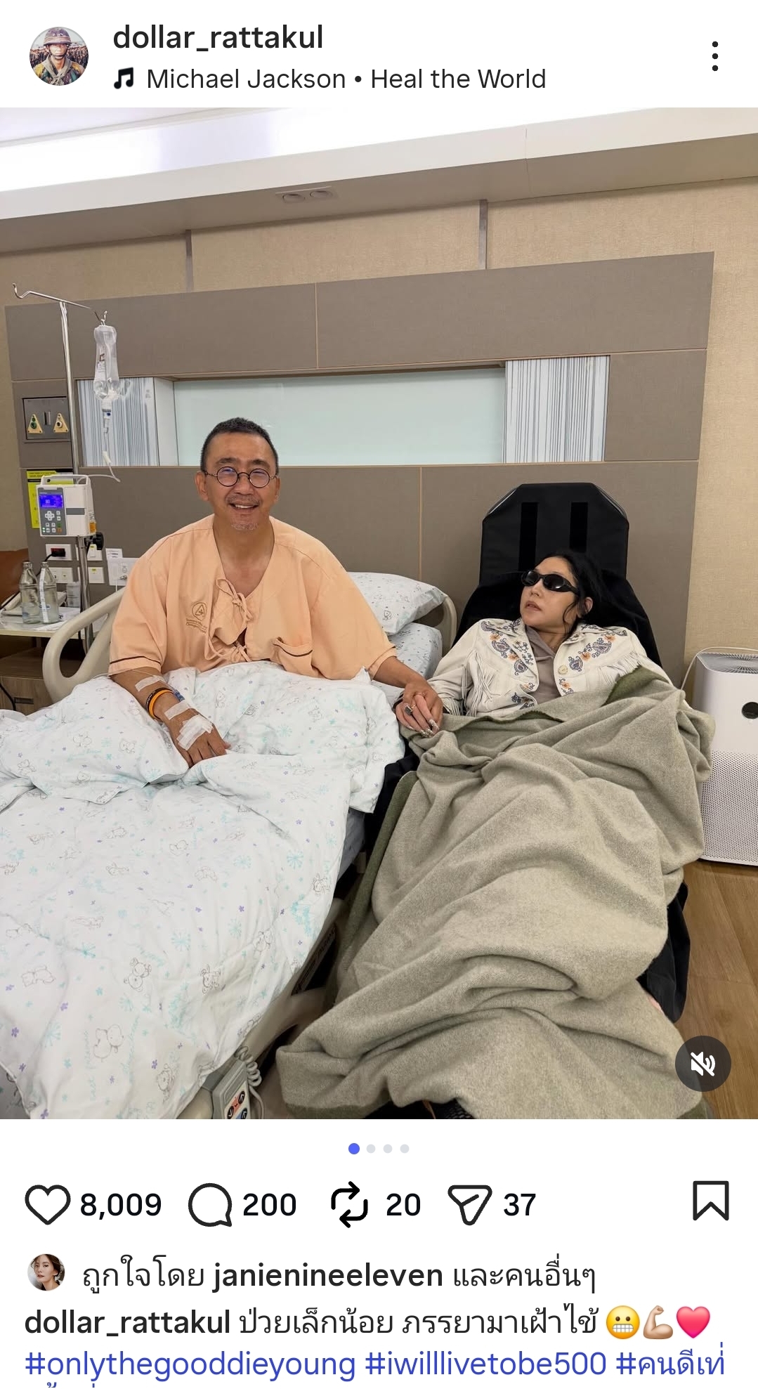 โดย เสธ.ดอลลาร์ ได้ระบุข้อความสุดน่ารักว่า “ป่วยเล็กน้อย ภรรยามาเฝ้าไข้” พร้อมแฮชแท็กสุดใจสู้อย่าง #iwilllivetobe500 ถือเป็นภาพที่ยืนยันคำว่า “ในยามสุขเราก็สุขด้วยกัน ในยามทุกข์เราจะไม่ทิ้งกัน” ได้ชัดเจนที่สุด ทำเอาแฟนคลับและคนในวงการบันเทิงแห่เข้ามากดไลก์และคอมเมนต์ให้กำลังใจทั้งคู่ให้หายป่วยไวๆ กันอย่างล้นหลาม