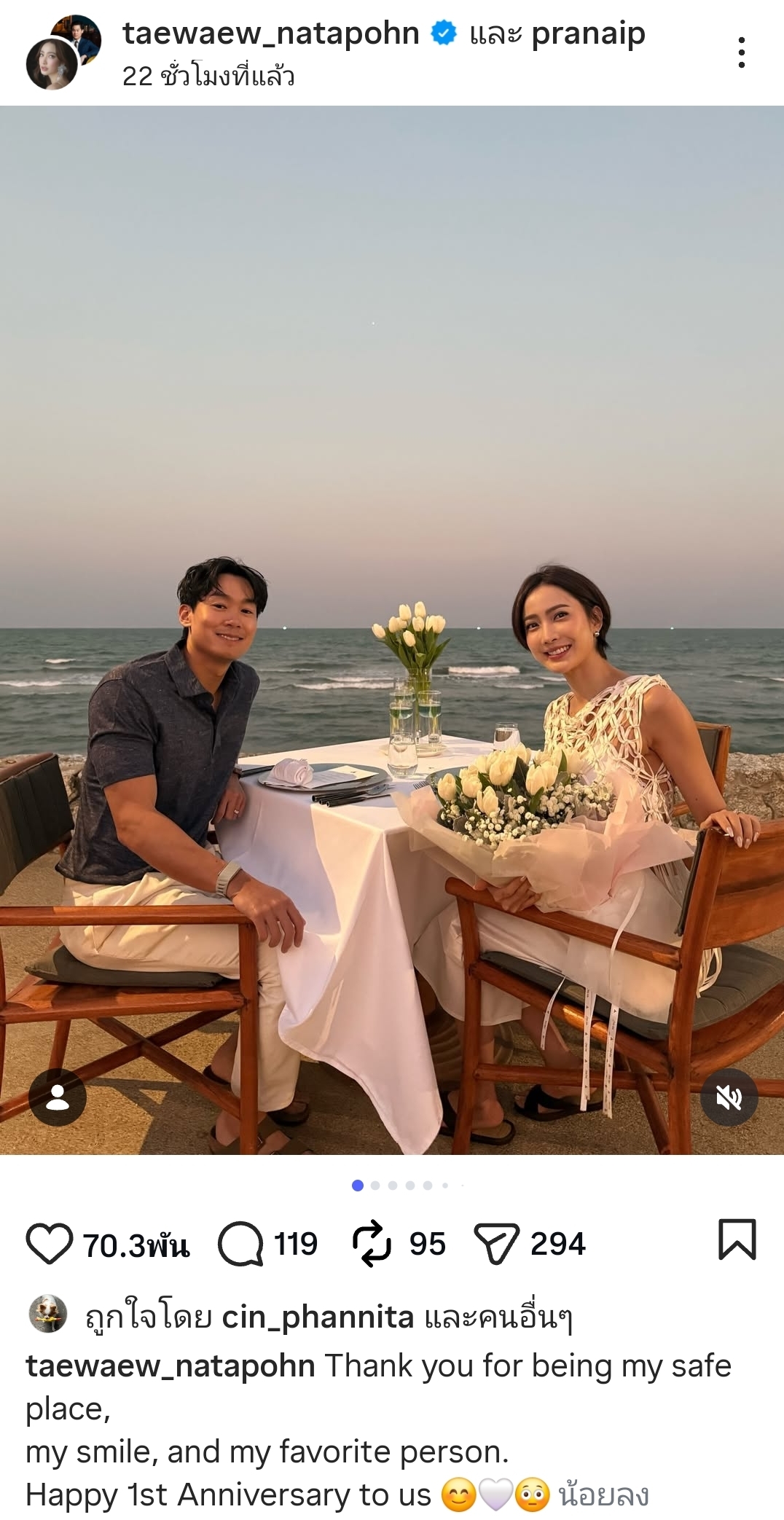​งานนี้สาวแต้วไม่ได้มาแค่ภาพสวยๆ นะคะแม่! เพราะเจ้าตัวยังร่ายมนต์สะกดด้วยแคปชั่นภาษาอังกฤษสุดกินใจ ขอบคุณฝ่ายชายที่คอยเป็น “Safe Place” หรือพื้นที่ปลอดภัย เป็นรอยยิ้ม และเป็นคนโปรดที่สุดในใจเสมอมา พร้อมปิดท้ายความหวานว่า “Happy 1st Anniversary to us” งานนี้ทำเอาเพื่อนพ้องในวงการและแฟนคลับแห่เข้ามากดหัวใจกันรัวๆ จนไอจีแทบค้าง ก็แหม… รักกันหวานขนาดนี้ มดไม่ขึ้นก็แปลกแล้วค่ะ!
