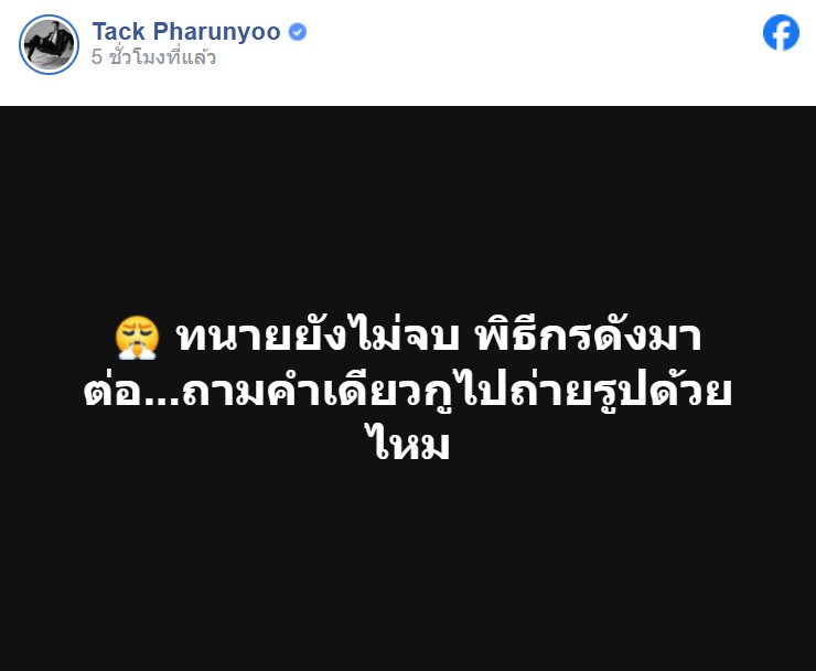 ด้าน แทค ภรัณยู ก็ไม่พลาดขอร่วมวงเมาท์ แต่เจ้าตัวดันเริ่มรู้สึกไม่ค่อยสบายใจนัก จึงโพสต์ข้อความเป็นอีโมจิถอนหายใจ พร้อมแคปชั่นชวนขำว่า