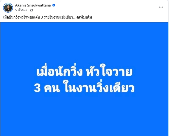 วันที่ 27 ม.ค. 2569 นพ.อกนิษฐ์ ศรีสุขวัฒนา หรือ “หมอแอร์” อายุรแพทย์โรคหัวใจ ผู้เชี่ยวชาญด้าน Sports Cardiology และนักไตรกีฬา โพสต์ข้อความผ่านเฟซบุ๊ก Akanis Srisukwattana ระบุว่า กรณีมีนักวิ่งหัวใจหยุดเต้นถึง 3 รายในงานแข่งขันเดียว ไม่ใช่เรื่องบังเอิญ แต่เป็นสัญญาณเตือนที่สังคมต้องให้ความสำคัญอย่างจริงจัง
