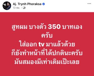 ล่าสุด เมื่อวันที่ 27 ม.ค.69 ทางด้าน อาจารย์ ตฤณห์ โพธิ์รักษา นักอาชญาวิทยา ได้ออกมาโพสต์ข้อความ เกี่ยวกับเรื่องสูท ผ่านเฟซบุ๊กส่วนตัวโดยระบุว่า “สูทผม บางตัว 350 บาทเองครับ ใส่ออก tv มาแล้วด้วย ก็ยังทำหน้าที่ได้ปกตินะครับ มันสมองมีเท่าเดิมเป๊ะเลย”
