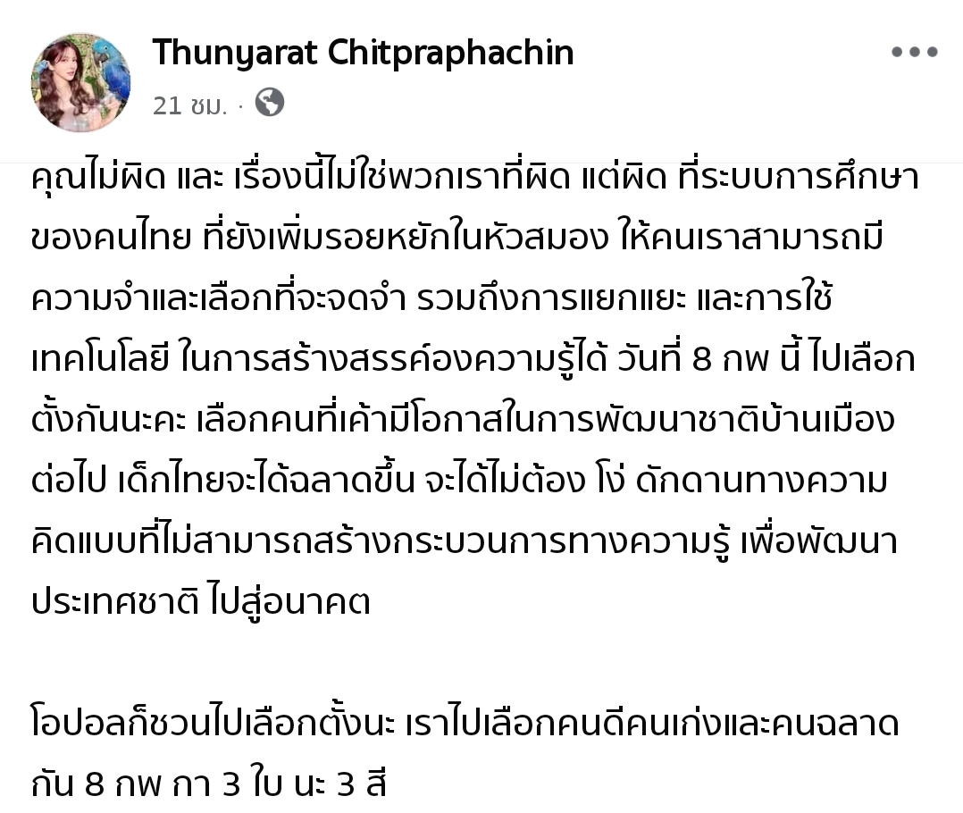 นอกจากนี้ ฟิล์ม ยังได้โพสต์ขยี้ประเด็นต่อผ่านเฟซบุ๊กส่วนตัว โดยชี้ให้เห็นว่าปัญหาการเลือกจดจำหรือการแยกแยะข้อมูลของคนในสังคมนั้น ส่วนหนึ่งมาจาก “ระบบการศึกษาไทย” ที่ไม่ได้ส่งเสริมกระบวนการคิดและสร้างสรรค์ความรู้อย่างมีประสิทธิภาพ พร้อมถือโอกาสนี้เชิญชวนให้ทุกคนออกไปใช้สิทธิ์เลือกตั้งในวันที่ 8 กุมภาพันธ์ที่จะถึงนี้ เพื่อเลือกคนเก่งและคนฉลาดเข้ามาพัฒนาชาติบ้านเมือง ให้เด็กไทยรุ่นหลังมีกระบวนการทางความคิดที่ก้าวหน้ากว่าที่เป็นอยู่