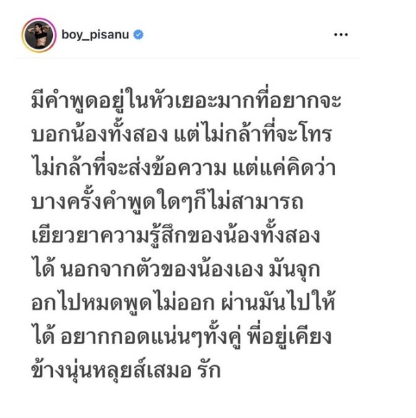 “มีคำพูดอยู่ในหัวเยอะมากที่อยากจะบอกน้องทั้งสอง แต่ไม่กล้าที่จะโทร ไม่กล้าที่จะส่งข้อความ เพราะบางครั้งคำพูดใดๆ ก็ไม่สามารถเยียวยาความรู้สึกได้ นอกจากตัวของน้องเอง มันจุกอกไปหมด พูดไม่ออก ผ่านมันไปให้ได้ อยากกอดแน่น ๆ ทั้งคู่ พี่อยู่เคียงข้างนุ่นหลุยส์เสมอ รัก”