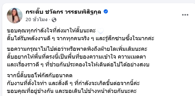 “ขอบคุณทุกกำลังใจที่ส่งมาให้ติ๊บนะคะ ติ๊บได้รับพลังงานดี ๆ จากทุกคนจริง ๆ และรู้สึกซาบซึ้งใจมากค่ะ ขอความกรุณาไม่ไปต่อว่าหรือพาดพิงถึงฝ่ายใดเพิ่มเติมนะคะ ติ๊บอยากให้พื้นที่ตรงนี้เป็นพื้นที่ของความเข้าใจ ความเมตตาและเรื่องราวดี ๆ ที่ช่วยกันประคองใจให้เดินต่อไปได้อย่างสงบ