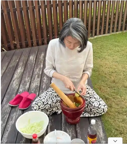 จากภาพและคลิปวิดีโอที่ปรากฏ เผยให้เห็นโมเมนต์ที่แสนเรียบง่าย โดยนิ้งมาในลุคธรรมชาติ ผมสั้นรับกับใบหน้า สวมเสื้อแขนยาวจับคู่กับกางเกงขายาวลายกราฟิกสีขาว-ดำ นั่งบนระเบียงไม้ในสวน ตรงหน้ามีครกไม้ใบใหญ่และวัตถุดิบครบครัน ทั้งเส้นมะละกอ มะเขือเทศ และเครื่องปรุงต่าง ๆ ซึ่งสีหน้าของอดีตนักแสดงดูผ่อนคลายทำให้เห็นถึงสุขภาพกายและใจที่ฟื้นฟูขึ้นมาก