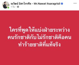 “ใครที่พูดให้แบ่งฝ่ายระหว่างคนรักชาติกับไม่รักชาติคือคนทำร้ายชาติที่แท้จริง“ ทั้งนี้ยังโพสต์ต่อเพิ่มเติมโดยระบุว่า “ยิ่งตัดสิทธิ์พรรคคู่แข่งคะแนนพรรคที่ถูกตัดจะยิ่งสูงขึ้นใบที่เลือกพรรครับรองท่วมท้นแน่”