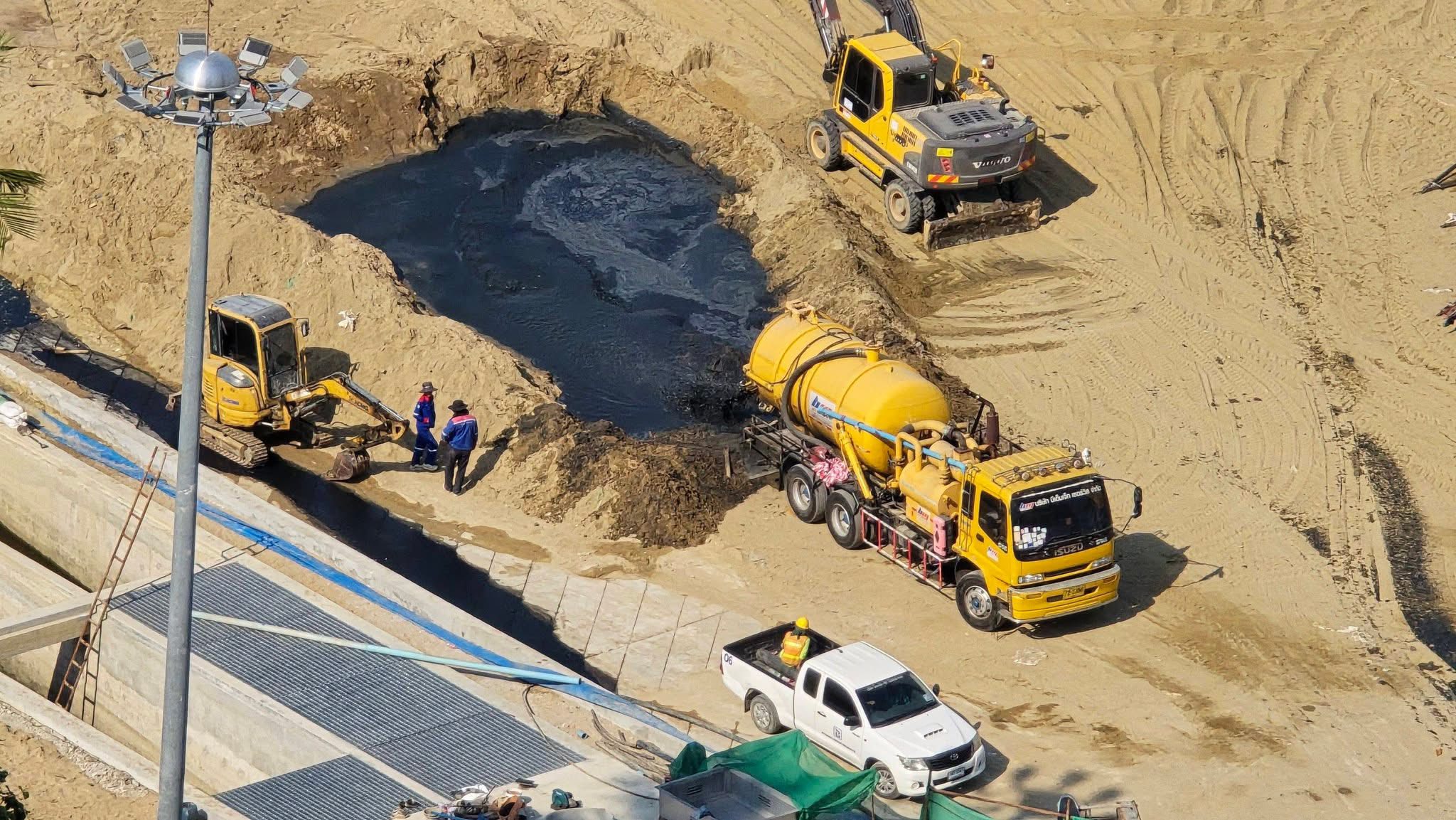ต่อมา มีรายงานว่า ผู้รับเหมาโครงการปรับปรุงภูมิทัศน์ ในพื้นที่ ได้ออกมาชี้แจงว่า เหตุการณ์ดังกล่าวเกิดจากอุบัติเหตุในระหว่างการทำงาน ไม่ได้มีเจตนาปล่อยน้ำเสียลงทะเลแต่อย่างใด อย่างไรก็ตาม คำชี้แจงดังกล่าวยังไม่สามารถคลายข้อสงสัยของสังคมได้