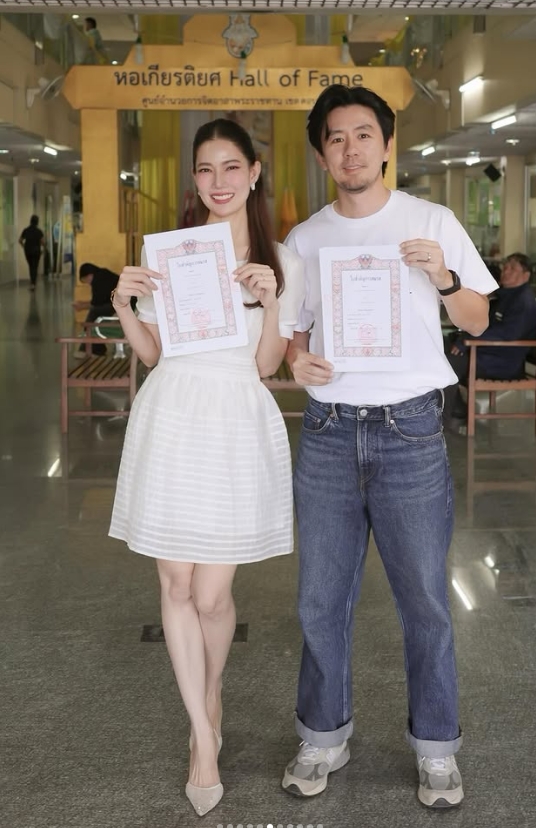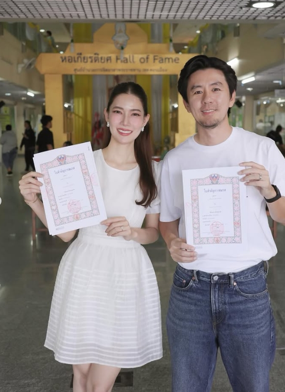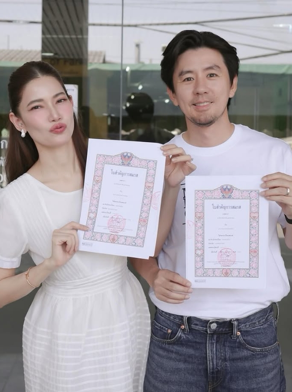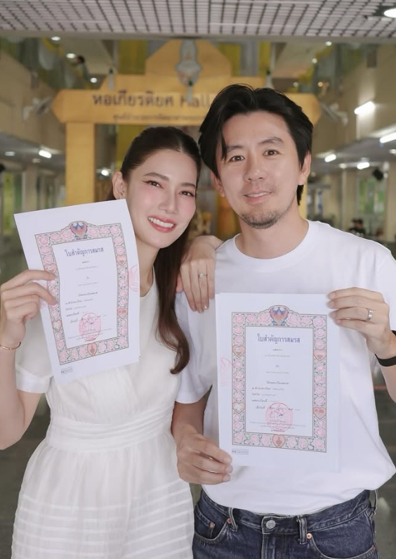 ล่าสุด ทั้งคุ่ ควงกันไปจดทะเบียนสมรส โดยมีสักขีพยาน พร้อมโพสต์ข้อความว่า.. 02.02.2569 11.19 น. ขอบคุณพยานทั้งสองคนด้วยนะจ๊ะ