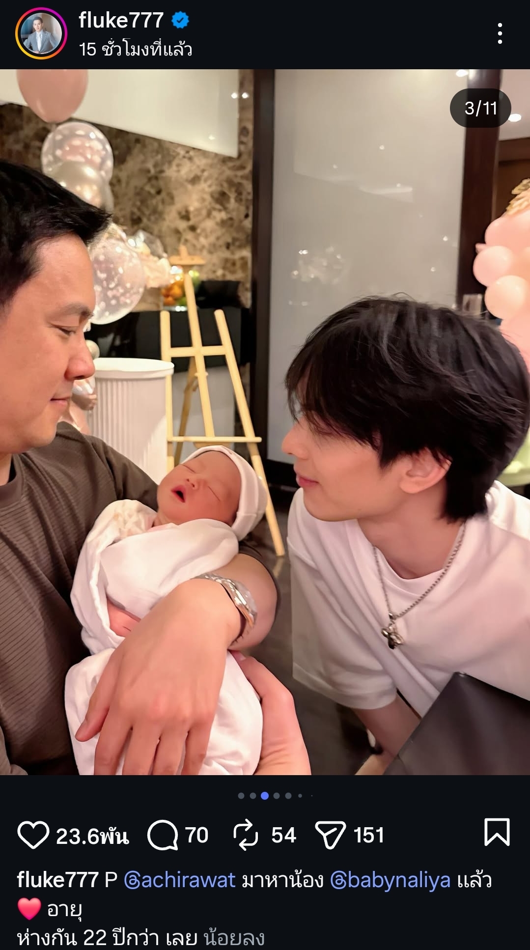 ในภาพเซตดังกล่าว เราได้เห็นโมเมนต์สุดละมุนของ “พี่อชิ” ที่บรรจงอุ้มน้องสาวตัวน้อยไว้ในอ้อมแขนอย่างทะนุถนอม สายตาที่พี่ชายมองน้องนั้นเต็มไปด้วยความรักและความอ่อนโยน ทำเอาแฟนคลับถึงกับใจละลาย โดยคุณพ่อฟลุ๊คได้ลงแคปชั่นระบุว่า “P @achirawat มาหาน้อง @babynaliya แล้ว อายุห่างกัน 22 ปีนาลียาเลยดูตัวน้อยลงไปเลย” ซึ่งเผยให้เห็นถึงความน่ารักของสองพี่น้องที่แม้จะมีช่วงวัยที่ห่างกันถึง 2 ทศวรรษ แต่สายใยความผูกพันนั้นแน่นแฟ้นอย่างเห็นได้ชัด