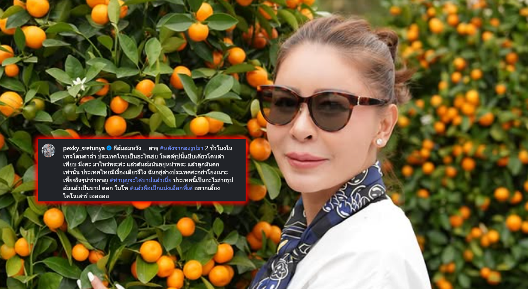โดยก่อนหน้าจะมีโพสต์ฟาดแรง เป็กกี้ได้ลงภาพและข้อความเกี่ยวกับการไปไหว้พระ พร้อมเล่าถึงต้นส้มที่อยู่หน้าพระ แต่กลับถูกคอมเมนต์ด่าทอและโยงการเมืองจำนวนมาก จนเจ้าตัวต้องระบายความอัดอั้นผ่านแคปชั่นเดือด ระบุว่าตนอยู่ต่างประเทศ และไม่มีเจตนาเกี่ยวข้องกับการเมือง พร้อมตั้งคำถามว่าประเทศไทยเป็นอะไร แค่ถ่ายรูปส้มก็กลายเป็นเรื่องใหญ่