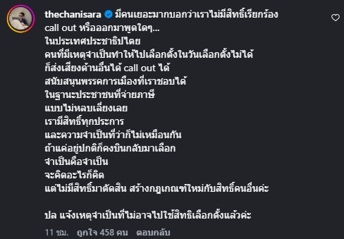 พร้อมเขียนเพิ่มเติมในคอมเมนต์อีกว่า “มีคนเยอะมากบอกว่าเราไม่มีสิทธิ์เรียกร้อง call out หรือออกมาพูดใดๆ ในประเทศประชาธิปไตย คนที่มีเหตุจำเป็นทำให้ไปเลือกตั้งในวันเลือกตั้งไม่ได้ก็ส่งเสียงด้านอื่นได้ call out ได้ สนับสนุนพรรคการเมืองที่เราชอบได้ ในฐานะประชาชนที่จ่ายภาษีแบบไม่หลบเลี่ยงเลยเรามีสิทธิ์ทุกประการ และความจำเป็นที่ว่าก็ไม่เหมือนกัน ถ้าแค่อยู่ปกติก็คงบินกลับมาเลือกจำเป็นคือจำเป็น จะคิดอะไรก็คิด แต่ไม่มีสิทธิ์มาตัดสิน สร้างกฎเกณฑ์ใหม่กับสิทธิ์คนอื่นค่ะ ปล.แจ้งเหตุจำเป็นที่ไม่อาจไปใช้สิทธิเลือกตั้งแล้วค่ะ”