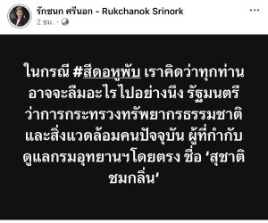 “ในกรณี สีดอหูพับ เราคิดว่าทุกท่าน อาจจะลืมอะไรไปอย่างนึง รัฐมนตรีว่าการกระทรวงทรัพยากรธรรมชาติและสิ่งแวดล้อม คนปัจจุบัน ผู้ที่กำกับดูแลกรมอุทยานฯโดยตรง ชื่อ สุชาติ ชมกลิ่น”