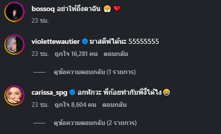 ทั้งนี้มีคนบันเทิง ต่างเข้ามาคอมเมนต์แซวขำกันรัวๆ โดย วี วิโอเลต ก็มาคอมเมนต์ด้วยว่า “มาสตีฟได้นะ 55555555” ขณะที่ คารีสา ก็มาแซวแบบขยี้หนักมากว่า “อกหักวะ พี่ก้อยทำกับพี่งี้ได้ไง” ซึ่ง บอส ก็มาตอบด้วยว่า “ทำได้น้า แต่หาให้พี่ด้วย”