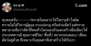 ต่อมา ทรายได้เคลื่อนไหวเพิ่มเติมอีกว่า “ทุกคนครับ-!ทรายไม่อยากให้ใครๆเข้าใจผิด ทรายไม่ได้วิจารผู้ดูแล moodeng หรือส่วนสัตว์ แต่ทราย พยายามสื่อว่าสัตว์ที่คนทั่วโลกมองถึงและสร้างชื่อเสียงให้ ประเทศควรมี คุณภาพชีวิต/ พื้นที่/ สถานรอบคอบ/ เพื่อน สัตว์อยู่ด้วย ที่เหมาะกับคุณค่าที่เขาสร้างให้กับเรา