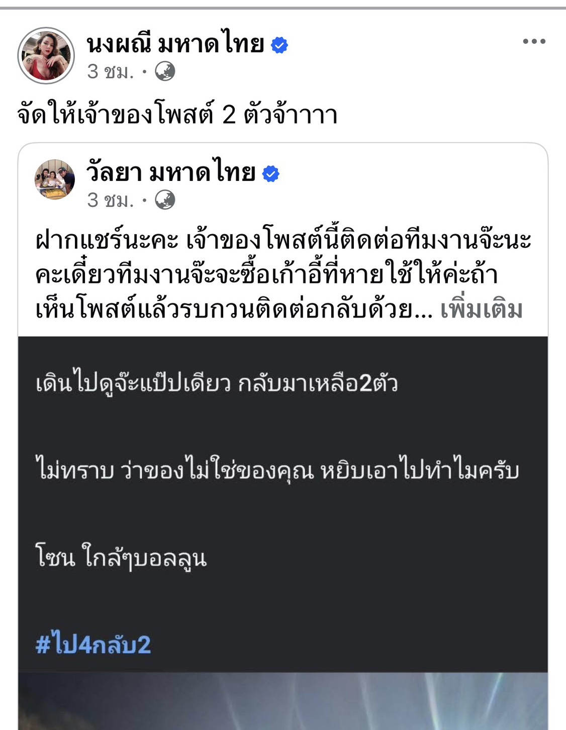 ทันทีที่ข้อความดังกล่าวถูกแชร์ออกไปจนถึงหูของนักร้องสาว เจ้าตัวก็ไม่รอช้า รีบออกมาแสดงความรับผิดชอบในทันที แม้ว่าเหตุการณ์ดังกล่าวจะไม่ได้เกิดจากความผิดของเธอหรือทีมงานโดยตรงก็ตาม โดย “จ๊ะ นงผณี” ได้แชร์โพสต์ดังกล่าวพร้อมระบุแคปชั่นสั้นๆ แต่ได้ใจความว่า “จัดให้เจ้าของโพสต์ 2 ตัวจ้าาาา” ขณะที่พี่สาวอย่างคุณ “วัลยา มหาดไทย” ซึ่งเป็นหนึ่งในทีมงานก็ได้ช่วยประสานงานผ่านโซเชียล เพื่อขอให้เจ้าของโพสต์รีบติดต่อกลับมาด่วน เพราะทีมงานเตรียมจะซื้อเก้าอี้ตัวใหม่คืนให้ครบตามจำนวนที่หายไป