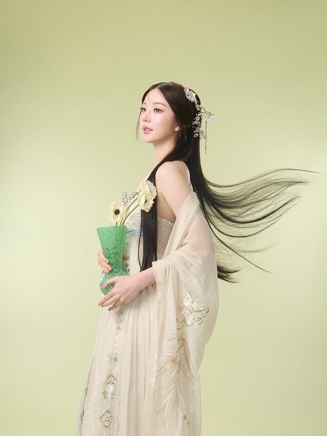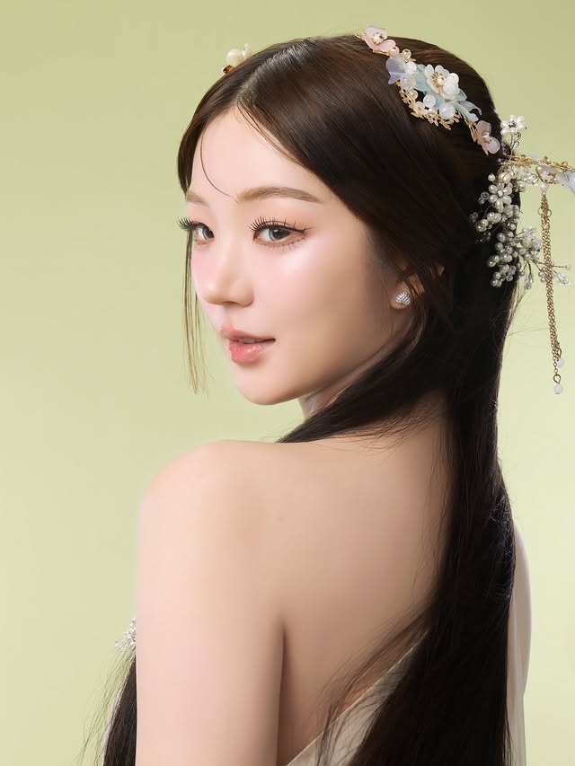 ลุคนี้มาในเดรสโทนครีมบางเบา เผยไหล่สวยอย่างมีคลาส จับคู่กับเฮดพีซดอกไม้และไข่มุกโทนฟ้า-ขาว เพิ่มดีเทลความอ่อนโยน ผมยาวดำขลับปล่อยพลิ้วไหว ยิ่งขับให้ใบหน้าดูหวานละมุนเหมือนหลุดออกมาจากซีรีส์จีนย้อนยุค