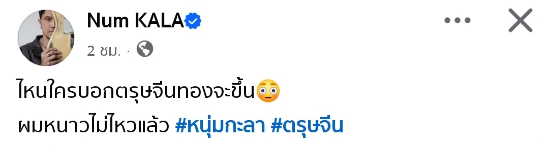 กลายเป็นโพสต์ไวรัลที่เรียกเสียงฮือฮาและสร้างรอยยิ้มให้กับเหล่าแฟนคลับและนักลงทุนทองคำในช่วงเทศกาลตรุษจีนเป็นอย่างมาก เมื่อศิลปินร็อคชื่อดังอย่าง “หนุ่ม กะลา” ได้ออกมาเคลื่อนไหวผ่านโซเชียลมีเดียส่วนตัวด้วยการโพสต์ภาพและข้อความที่สะท้อนถึงสถานการณ์ตลาดทองคำในปัจจุบัน โดยเจ้าตัวได้ลงภาพตัดต่อสุดฮาเป็นใบหน้าของตัวเองที่ถูกฝังอยู่ในกองหิมะหนาทึบ ท่ามกลางบรรยากาศเทือกเขาสูงที่ดูหนาวเหน็บสุดขั้ว พร้อมระบุข้อความประกอบว่า “ไหนใครบอกตรุษจีนทองจะขึ้น ผมหนาวไม่ไหวแล้ว” พร้อมติดแฮชแท็ก #หนุ่มกะลา และ #ตรุษจีน เพื่อเป็นการล้อเลียนสถานการณ์ที่เหล่านักลงทุนมักเรียกกันว่าอาการ “ติดดอย” หรือการซื้อสินทรัพย์มาในราคาสูงแต่ราคาตลาดกลับร่วงลงจนไม่สามารถขายทำกำไรได้