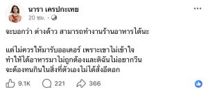 โดยเนื้อหาในโพสต์ระบุว่า “จะบอกว่า ต่างด้าว สามารถทำงานร้านอาหารได้นะ แต่ไม่ควรให้มารับออเดอร์ เพราะเขาไม่เข้าใจทำให้ได้อาหารมาไม่ถูกต้องและดิฉันไม่อยากวีน จะต้องทนกินในสิ่งที่ตัวเองไม่ได้สั่งอีดอก”