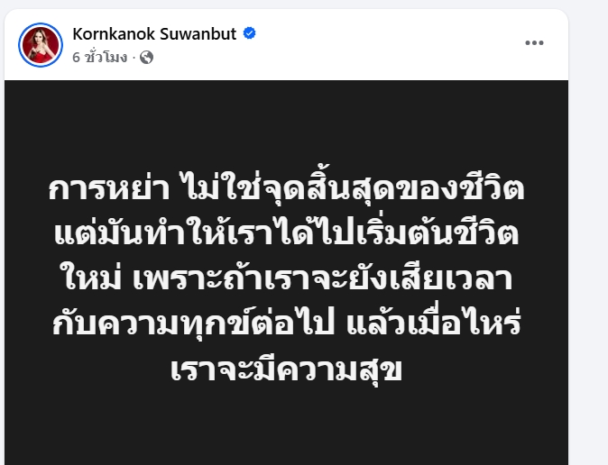 ออกมาโพสต์ข้อความตัดพ้อเกี่ยวกับการหย่าทางเฟซบุ๊ก โดยระบุว่า “การหย่า ไม่ใช่จุดสิ้นสุดของชีวิต แต่มันทำให้เราได้ไปเริ่มต้นชีวิตใหม่ เพราะถ้าเราจะยังเสียเวลากับความทุกข์ต่อไป แล้วเมื่อไหร่ เราจะมีความสุข”