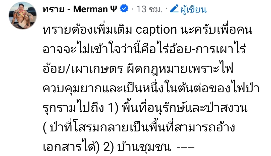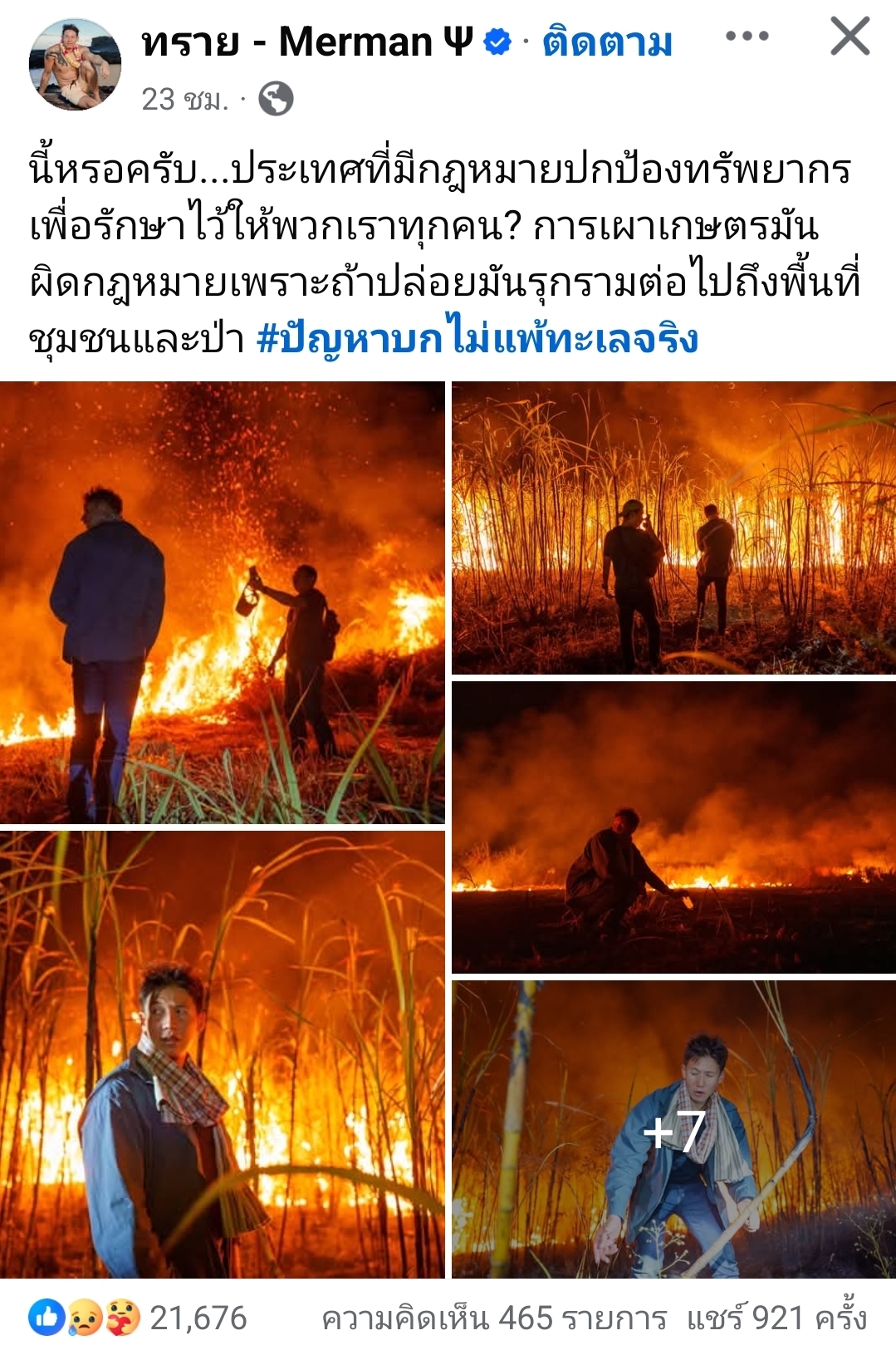 โดยหนุ่มทรายได้ระบุข้อความเชิงตัดพ้อแต่แฝงไปด้วยความดุดันว่า “นี้หรอครับ…ประเทศที่มีกฎหมายปกป้องทรัพยากรเพื่อรักษาไว้ให้พวกเราทุกคน?” พร้อมกับตั้งคำถามถึงประสิทธิภาพของข้อบังคับใช้ เพราะการเผาพื้นที่เกษตรนั้น นอกจากจะผิดกฎหมายแล้ว ยังเป็นต้นตอของหายนะที่รุกรานไปถึงพื้นที่ชุมชนและผืนป่าอันล้ำค่า พร้อมติดแฮชแท็กประกาศจุดยืนชัดเจนว่า #ปัญหาบกไม่แพ้ทะเลจริง
