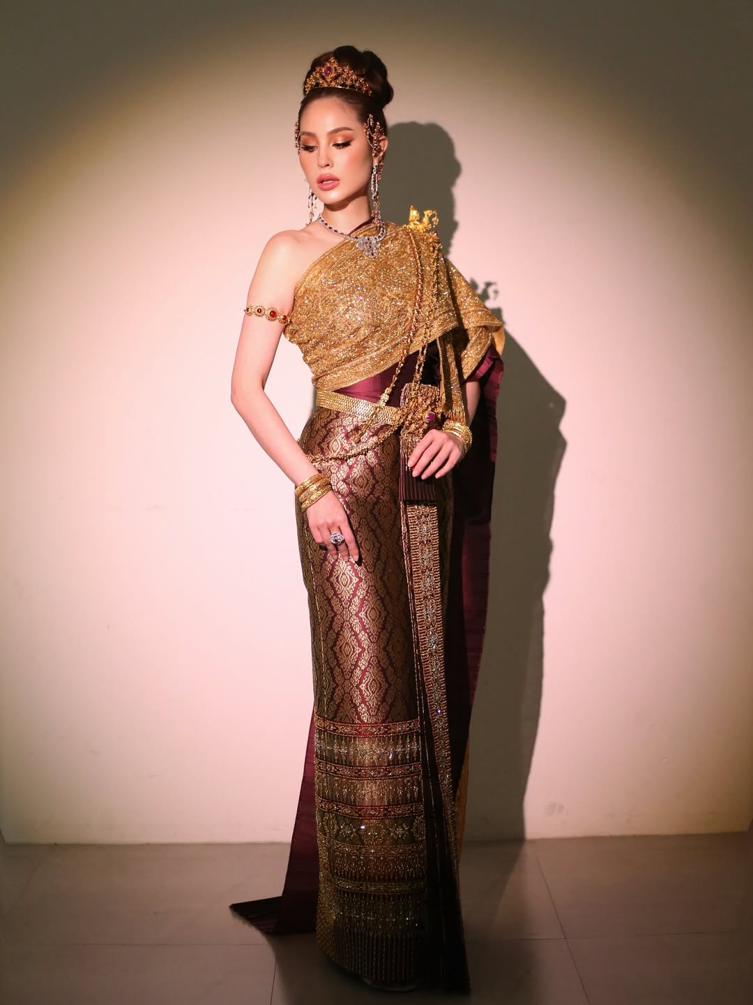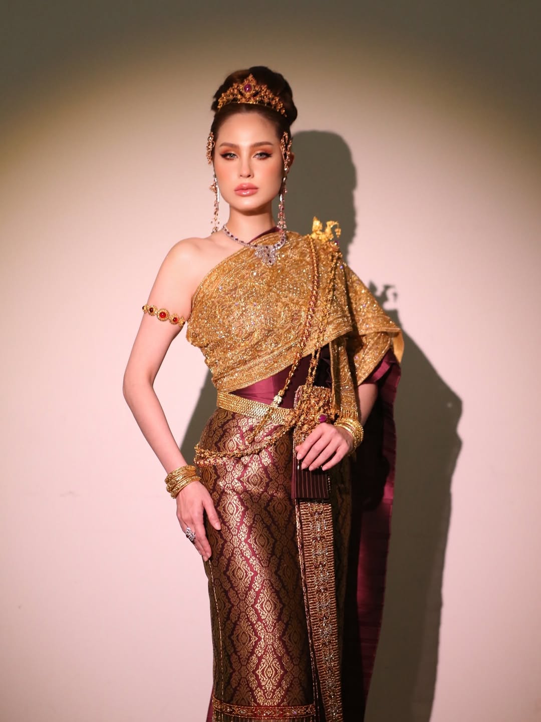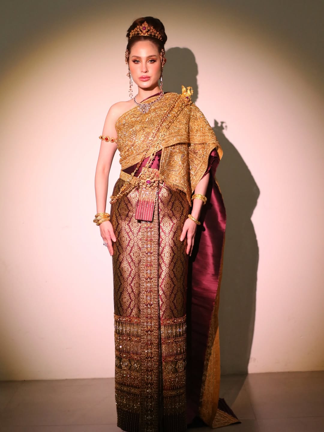 สำหรับลุคนี้ ขวัญ อุษามณี มาในชุดไทยห่มสไบโทนสีม่วงเม็ดมะปรางเข้มที่ดูหรูหราและมีพลัง ตัดกับงานปักดิ้นทองคำแท้ทั้งผืนที่ส่องประกายระยิบระยับล้อแสงไฟ ตัวสไบมีการไล่เลเยอร์ของลายปักที่ละเอียดลออสะท้อนถึงงานฝีมือชั้นสูง สวมทับบนผ้าถุงทอยกทองลายอย่างที่ส่งเสริมรูปร่างให้ดูสง่างามดุจพญาหงส์ การเลือกใช้โทนสีทองสว่างบนพื้นสีม่วงเข้มไม่เพียงแต่ช่วยขับผิวขาวออร่าของเธอให้ดูโดดเด่นขึ้นเท่านั้น แต่ยังเสริมสร้างบารมีให้ลุคนี้ดูสูงศักดิ์ราวกับเจ้าหญิงในราชสำนักโบราณ