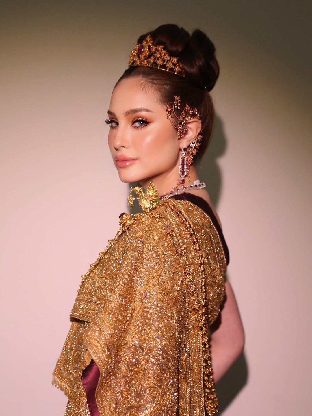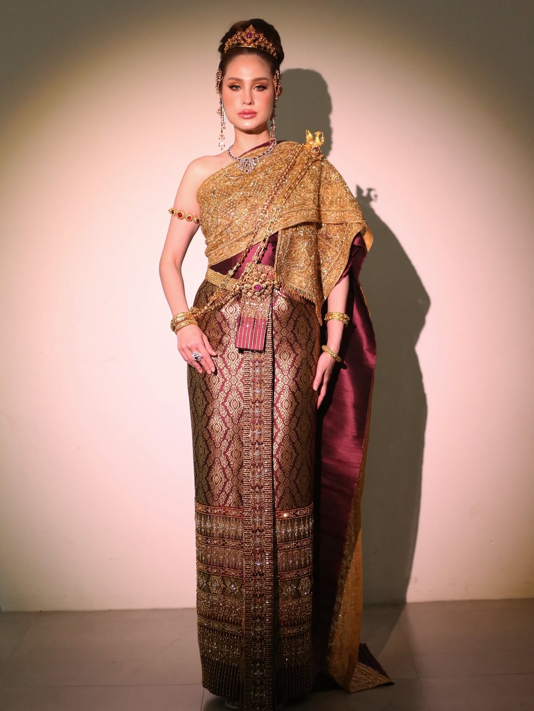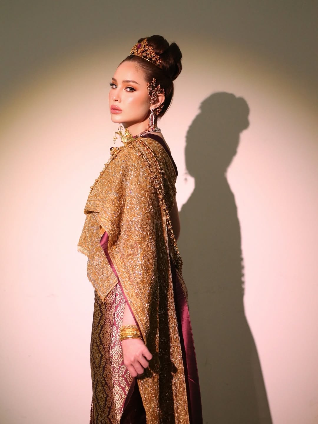 สำหรับลุคนี้ ขวัญ อุษามณี มาในชุดไทยห่มสไบโทนสีม่วงเม็ดมะปรางเข้มที่ดูหรูหราและมีพลัง ตัดกับงานปักดิ้นทองคำแท้ทั้งผืนที่ส่องประกายระยิบระยับล้อแสงไฟ ตัวสไบมีการไล่เลเยอร์ของลายปักที่ละเอียดลออสะท้อนถึงงานฝีมือชั้นสูง สวมทับบนผ้าถุงทอยกทองลายอย่างที่ส่งเสริมรูปร่างให้ดูสง่างามดุจพญาหงส์ การเลือกใช้โทนสีทองสว่างบนพื้นสีม่วงเข้มไม่เพียงแต่ช่วยขับผิวขาวออร่าของเธอให้ดูโดดเด่นขึ้นเท่านั้น แต่ยังเสริมสร้างบารมีให้ลุคนี้ดูสูงศักดิ์ราวกับเจ้าหญิงในราชสำนักโบราณ