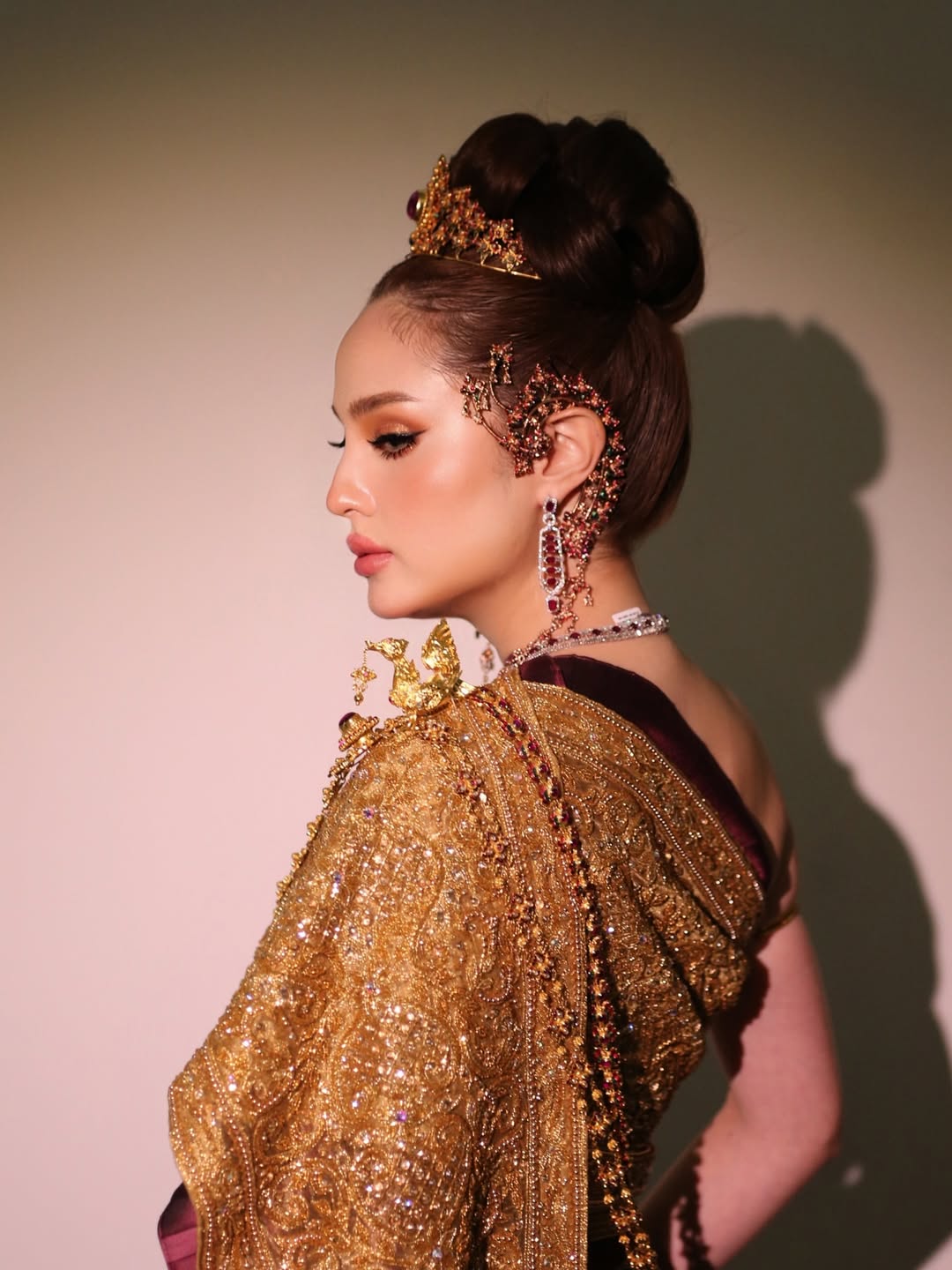 เครื่องประดับที่เธอเลือกใช้นั้นถือเป็นอีกหนึ่งไฮไลต์ที่ไม่อาจมองข้ามได้ เพราะเป็นเครื่องทองชุดใหญ่ที่ครบเครื่อง ตั้งแต่เกี้ยวทองประดับอัญมณีสีแดงทับทิมบนมวยผมที่จัดแต่งอย่างเรียบร้อยแต่ดูหรูหรา ต่างหูระย้า สร้อยคอ และปั้นเหน่งทองคำที่คาดทับสายรัดเอวอย่างประจวบเหมาะ ทุกชิ้นส่วนถูกออกแบบมาเพื่อส่งเสริมกันและกัน ทำให้ภาพรวมของเธอดูมีความอ่อนช้อยแบบกุลสตรี แต่ในขณะเดียวกันก็สัมผัสได้ถึงความนิ่งขรึมและทรงอำนาจ